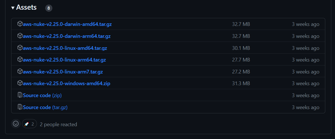aws-nuke 실행 파일은 github releases에서 받을 수 있습니다.