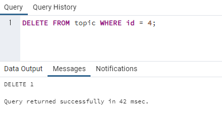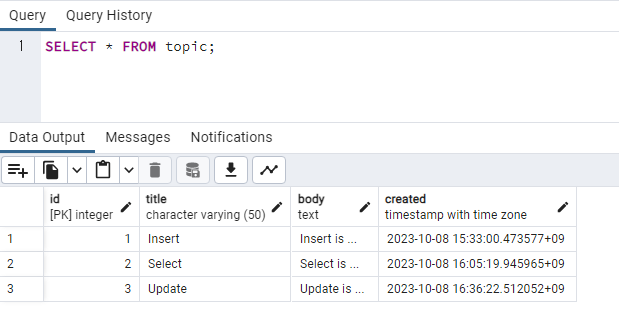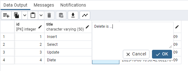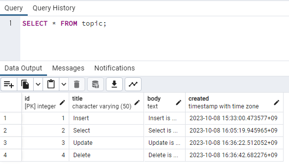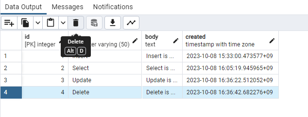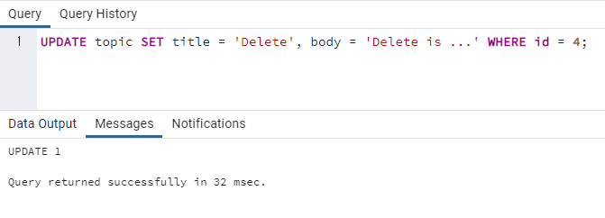 id 값이 4인 행에서 title은 'Delete'로, body는 'Delete is ...'로 변경이 잘 된 것을 확인할 수 있습니다.