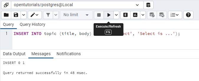 Execute/Refresh 버튼을 누르면, SQL문이 Database Server로 전송되어 Data가 생성됩니다. 그 결과도 아래에 Messages로 나타납니다.