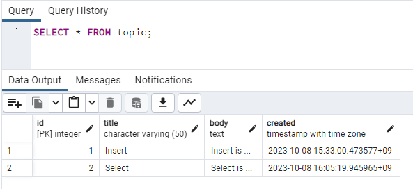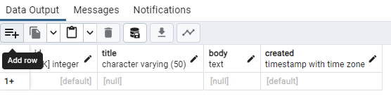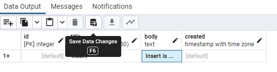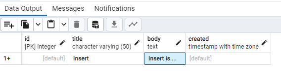 id, created는 자동으로 값이 채워지기 때문에 default로 놔두고, title과 body를 각각 입력합니다.