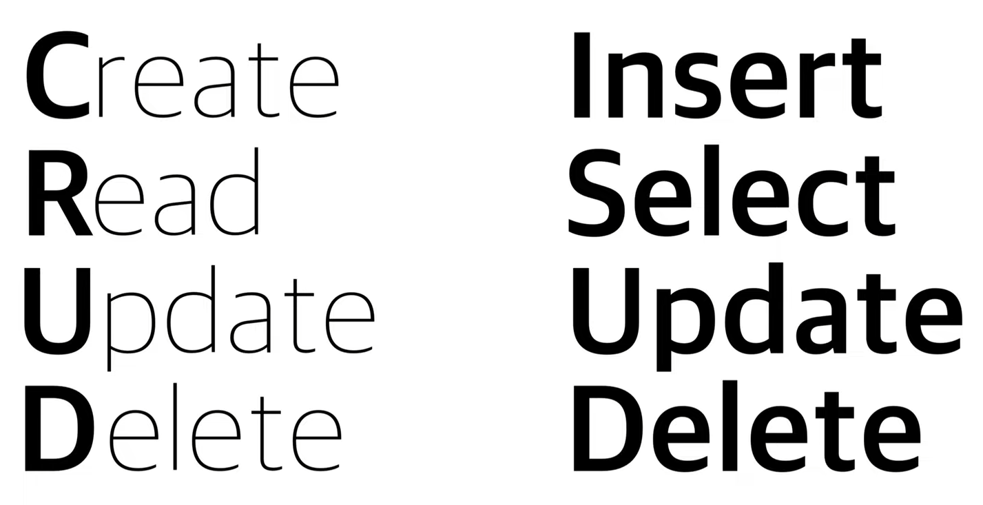 CRUD는 Create, Read, Update, Delete를 뜻합니다. 이 작업을 수행하는 SQL 명령은 각각 Insert, Select, Update, Delete입니다.