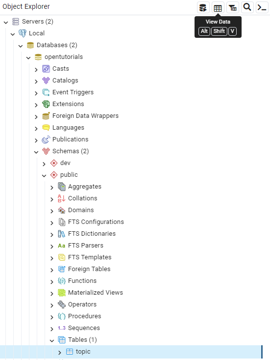 pgAdmin 4에서 Table을 선택한 뒤, Object Explorer와 같은 라인에 있는 View Data를 누릅니다.