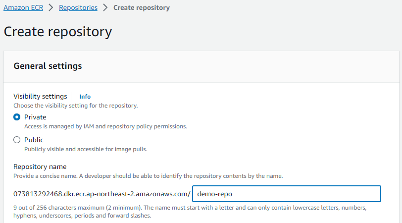 Visibility settings에서 Private을 선택하고, Repository의 이름을 지정합니다.