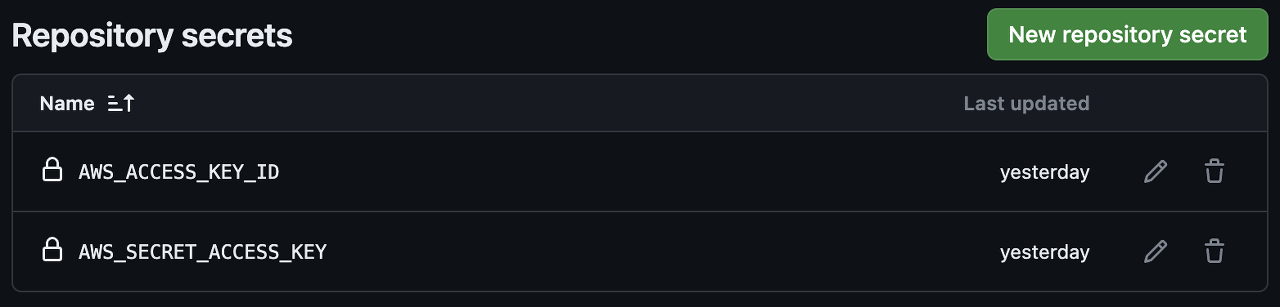 배포에 필요한 권한을 가지고 있는 IAM User에서 Access Key를 발급받은 후, Repository secrets에서 AWS_ACCESS_KEY_ID, AWS_SECRET_ACCESS_KEY를 각각 등록합니다.