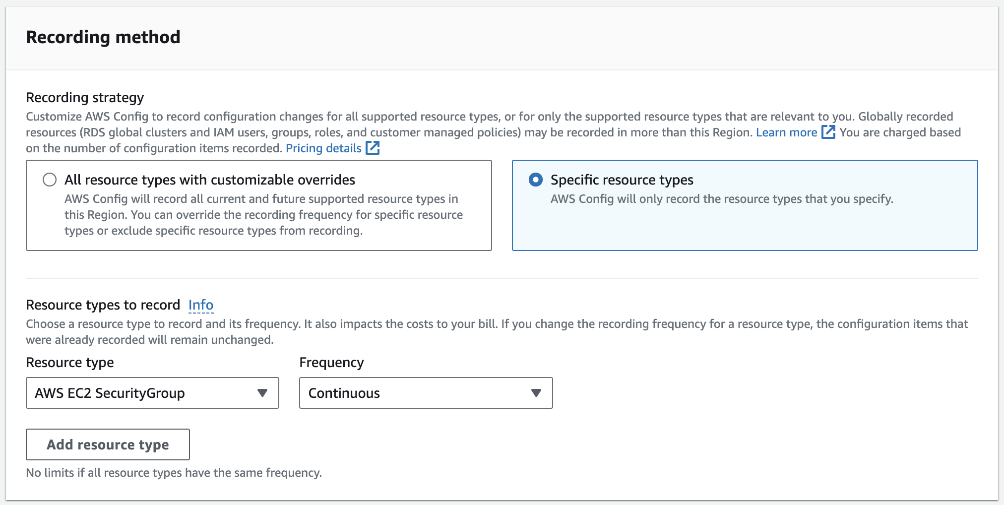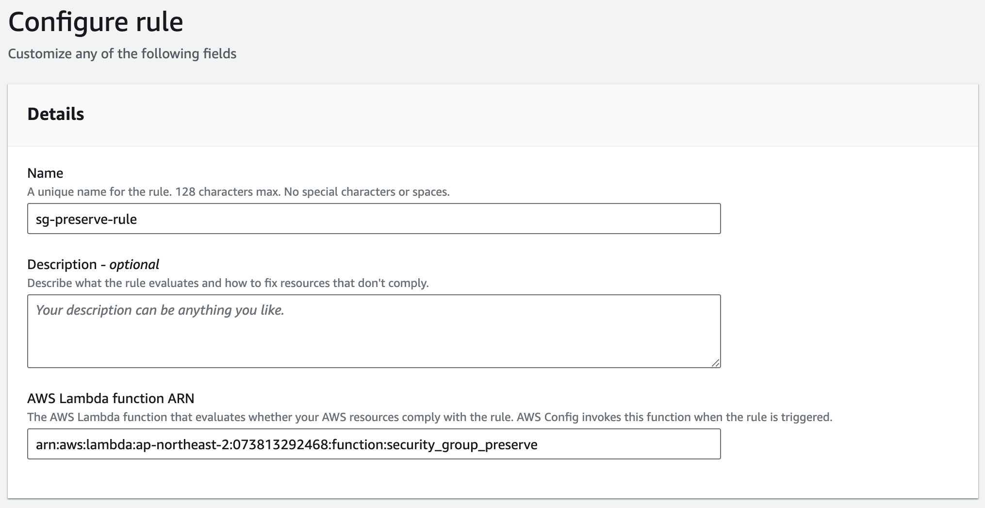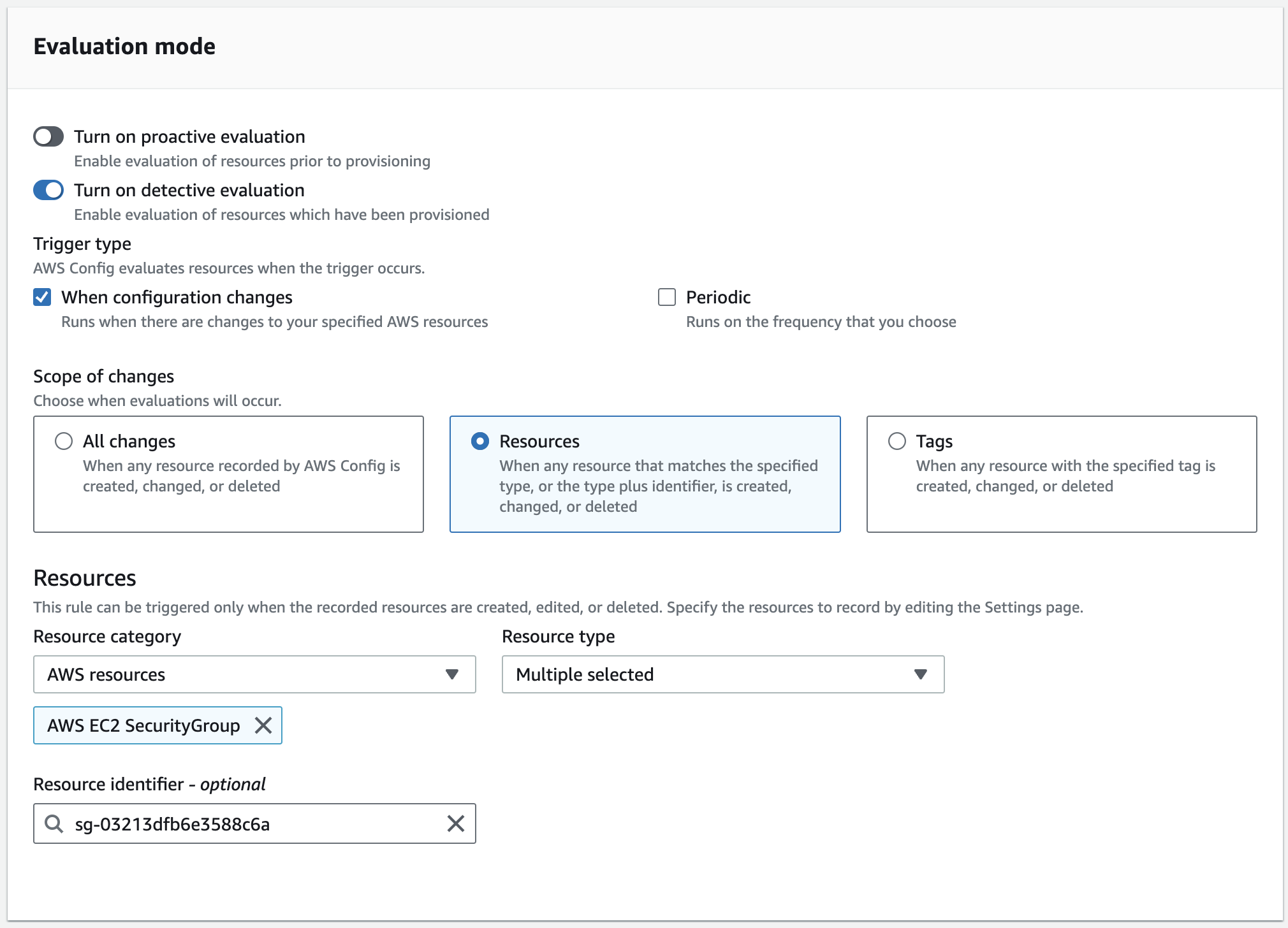 프로비저닝 된 리소스만 평가하게 하고, 특정한 보안그룹의 설정이나 값이 변경되었을 때만 Lambda Function이 평가하도록 합니다.