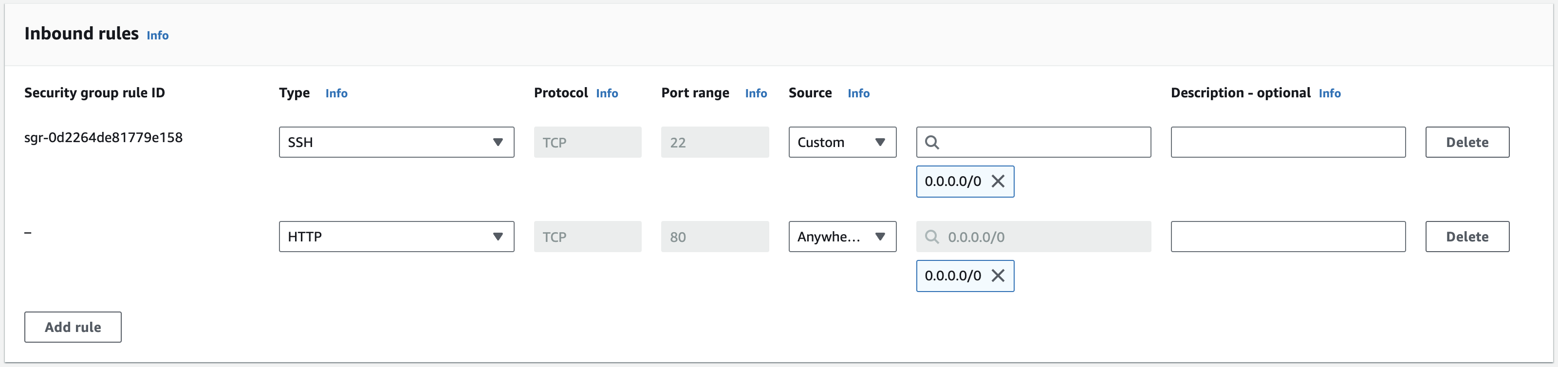 inbound rule에 ssh rule에 더해 http rule도 추가해 줍니다.