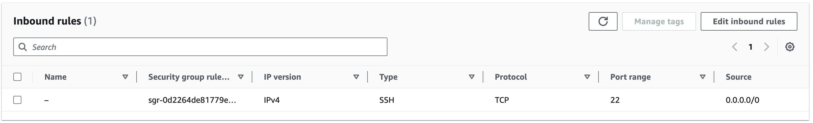 inbound rule로 22번(SSH) 포트만 허용합니다. 인스턴스로 SSH 연결만 한다는 가정으로 ssh inbound rule만 유지되게 만드는 것입니다.