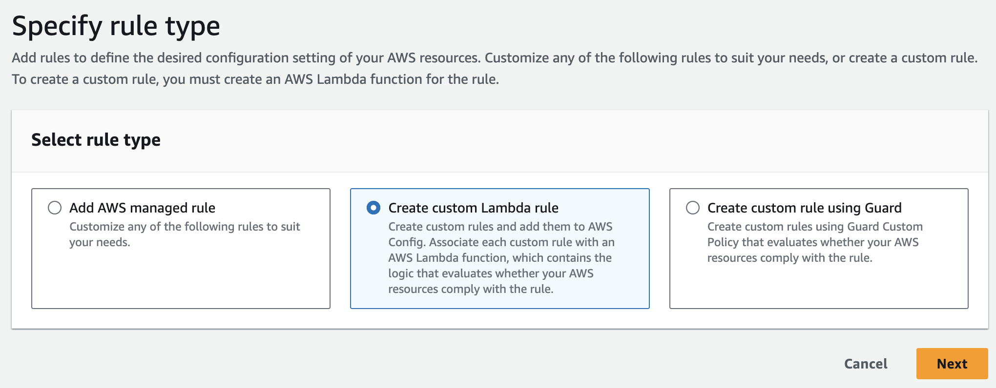 Lambda를 사용하여 리소스의 상태를 정의하고 관리하기 위해 Create custom Lambda rule을 선택합니다. Next를 누릅니다.