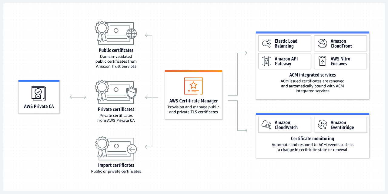 AWS Certificate Manager(ACM)는 AWS 웹 사이트와 애플리케이션을 보호하는 퍼블릭 및 프라이빗 SSL/TLS X.509 인증서와 키를 만들고, 저장하고, 갱신하는 복잡성을 처리합니다.