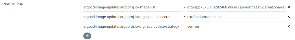 argocd-image-updater.argoproj.io/image-list: org/app=<IMAGE_REPOSITORY_URL>/<IMAGE_REPOSITORY_NAME> # Pod에 사용할 Image 정의, org/app을 alias로 사용