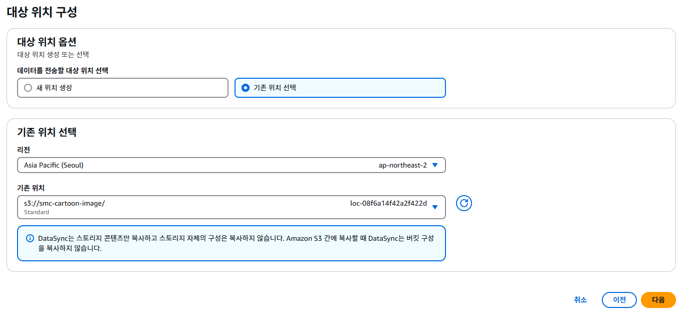 대상 위치는 AWS CLI를 통해 미리 생성했으므로 "기존 위치 선택"을 눌러 선택할 수 있습니다.