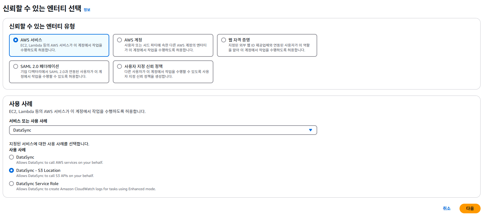 대상 S3 버킷에 액세스 하기 위해 IAM Role을 생성합니다. 사용 사례로 "DataSync - S3 Location"을 선택합니다.