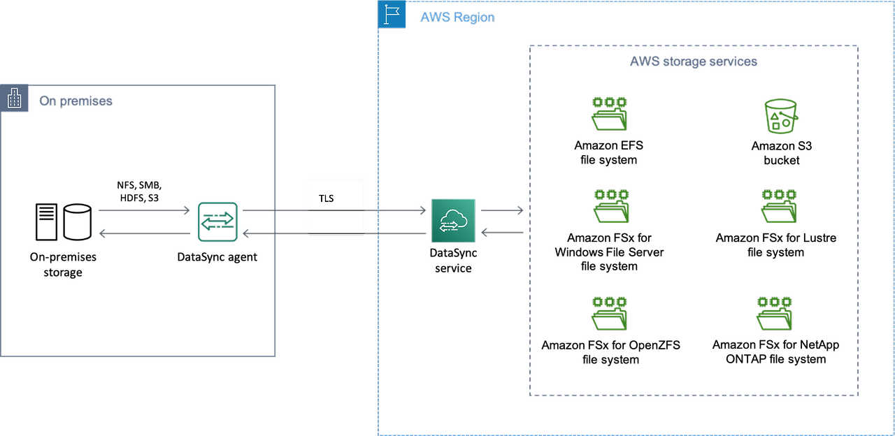 AWS DataSync는 AWS로의 데이터 마이그레이션을 간소화 및 가속화하고 온프레미스 스토리지, 엣지 로케이션, 다른 클라우드 공급자 및 AWS 스토리지 간에 데이터를 빠르고 안전하게 이동하는 데 도움이 되는 온라인 데이터 이동 및 검색 서비스입니다. Amazon S3, Amazon EFS, Amazon FSx 등의 스토리지를 지원하며, 성공적으로 데이터 마이그레이션 및 동기화를 수행할 수 있습니다.