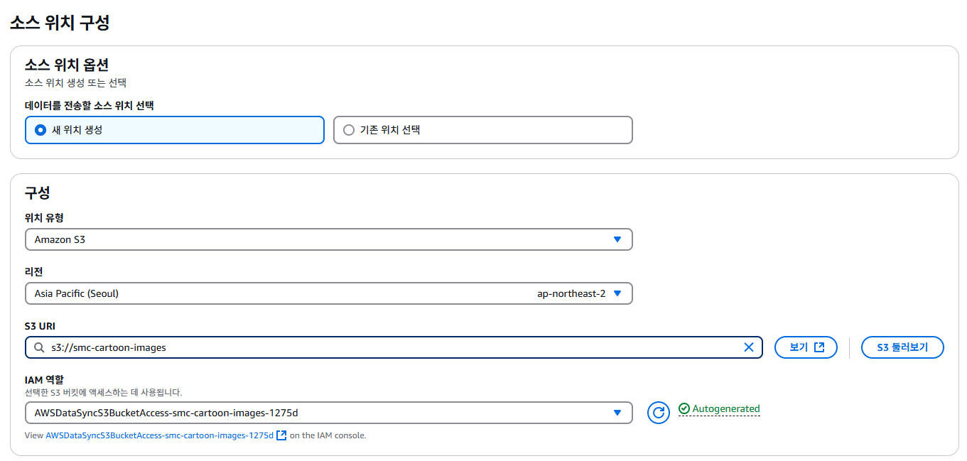 DataSync 콘솔에서 "태스크 생성"을 누릅니다. "새 위치 생성"에서 소스 S3 버킷을 선택하고, IAM Role은 "자동 생성"을 눌러 생성할 수 있습니다.