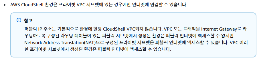 기본적으로 CloudShell VPC 모드에서는 NAT Gateway를 사용하여 인터넷에 액세스 할 수 있습니다.