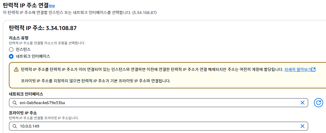 이제 EIP를 생성하고, ENI에 연결하겠습니다.