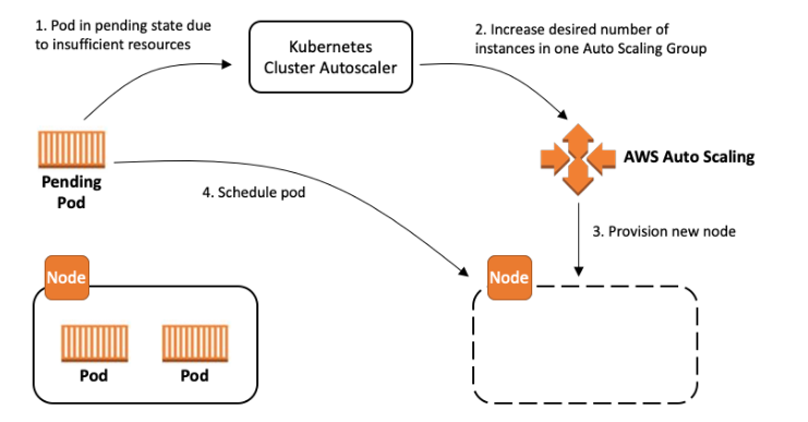 그러나 HPA로 Pod를 늘리다보면 EC2 Node 리소스가 부족해져 Pod가 Pending 상태에 놓이게 됩니다. 이때, Cluster Autoscaler를 사용하면 Node를 자동으로 증축시켜 Node 리소스 부족에 대처할 수 있습니다. 또한, 부하 감소로 활용도가 낮은 Node가 있다면 Node를 축소시키기도 합니다.